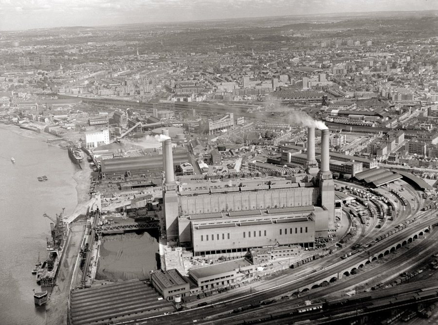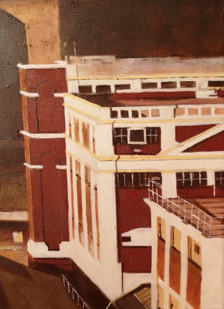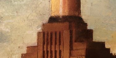 The geometry of the objects is critical to the success of the painting yet difficult to determine from printed A4 copies of the picture. I got quite far into the painting before I realised that there was a clear vanishing point from which, as even the most basic level art student will tell you, will allow you to determine some of the lines of trajectory. School boy error! All was not lost though, I managed to get the trajectory lines quite close to where they should be. The lines which determine the angle of the Power Station emanated from a vanishing point which was off the canvas. I guess I could have worked out the lines using scaled angles but again, I had already done so much and it was also so close to how it should be, it wasn’t worth changing the edges of the whole building and potentially spoiling what I’d done to that point.