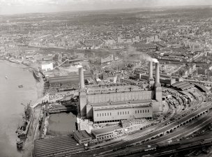 What were the sequence of red blobs that line up on the shadowed area on the left of the painting, disappearing towards the bridge? None of the source images I could lay my hands on seemed to provide the answer. In some pictures they looked like small houses, but I dicided they couldn't be, just too small in scale. They looked like vans/lorries. Maybe Royal Mail vans lined up in a neat row. Looking at the aerial shots of the area shows there were railway lines from the area we see clearly in the picture, right to the distant lines relecting a tiny amount of light. Where these blobs are situated are right on a slightly eleveated rail lines that come and go to a different part of London. There is simply no plausible way nor room for vans of any sort to be situated there. They must be railway carriages...But just don't look like railway carriages. Anybody have an opinion...please let me know.